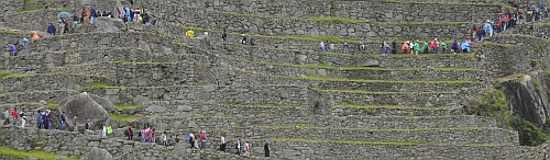 Hier einige der Besucherregeln: -Die Anlage ist von 6:00 bis 17:00 offen. Um sechs Uhr morgens kommt man aber nur rein, wenn man ab 5:40 Schlange steht (in der Nebensaison). So hat man keine Chance, die Ruinen bei Sonnenauf oder -untergang zu bestaunen. -Es sind nur kleine 20 Liter Rucksäcke erlaubt. Das wird sehr genau kontrolliert, da sehr einfach. Meine Foto- und Regenausrüstung wurden knapp durchgelassen, das Stativ musste draussen warten. -Man darf keine Wegwerftrinkflaschen und keine Lebensmittel hinein nehmen und in der Anlage gibt es nichts zu kaufen. Sie gehen wohl davon aus, dass man nur eine 2-3stündige geführte Tour macht. Ich war nach 11 Stunden recht durstig. Das Problem ist, dass sie gar nicht kontrollieren können, was man im Rucksack hat, entsprechend liegt trotzdem Abfall rum. -Den Aussichtsberg Waynapicchu dürfen nur 400 Leute pro Tag besteigen: 200 ab 7:00 und 200 ab 10:00. Um eine Chance zu haben, bei diesen 400 zu sein, muss man möglichst früh anstehen. Ich bin um 6:30 angestanden und konnte als 175zigste um 7:50 los marschieren. -Toiletten gibt es nur am Eingang: weiss nicht was sie sich vorstellen, was man tun soll, wenn man nach 1-2 Stunden Anstieg zum Aussichtsberg ein dringendes Bedürfnis hat...(man darf ja dann nicht nochmals hoch).